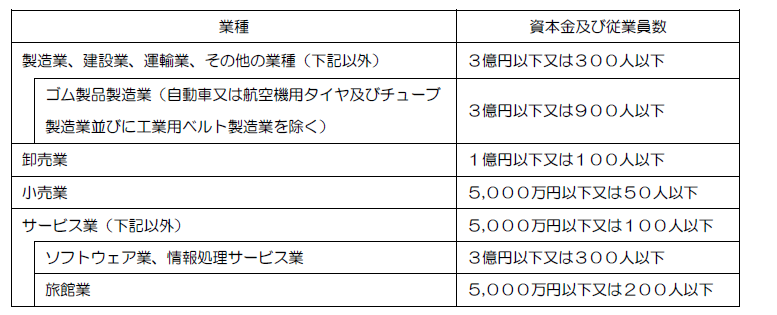 中小企業者とは、以下に該当する事業者で、大企業が実質的に経営に参画していない者をいいます。