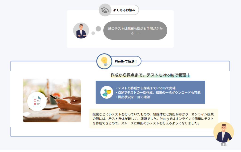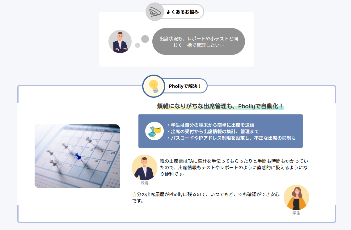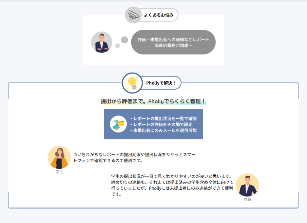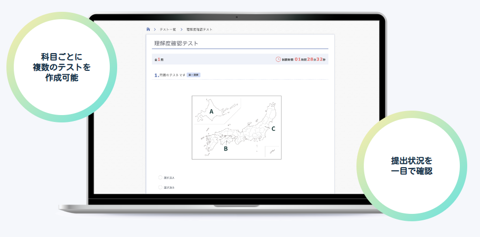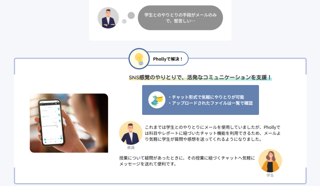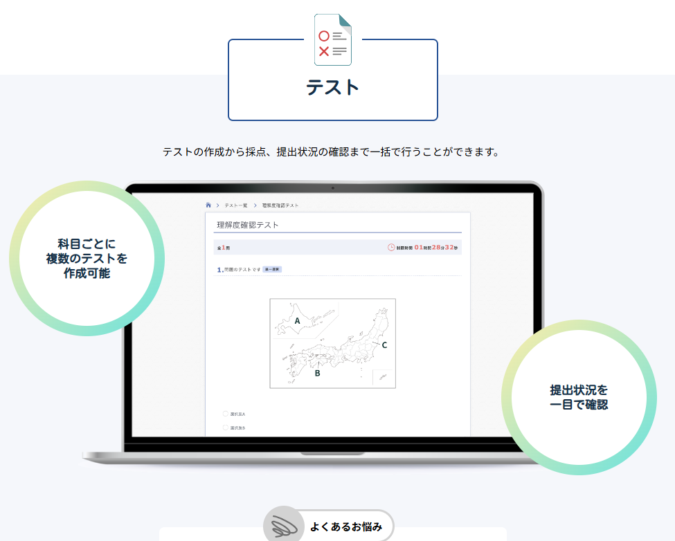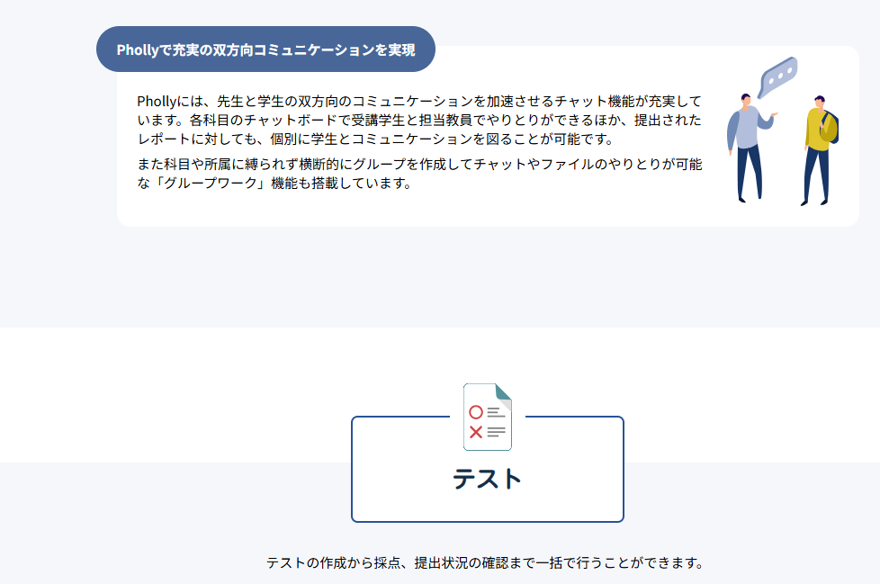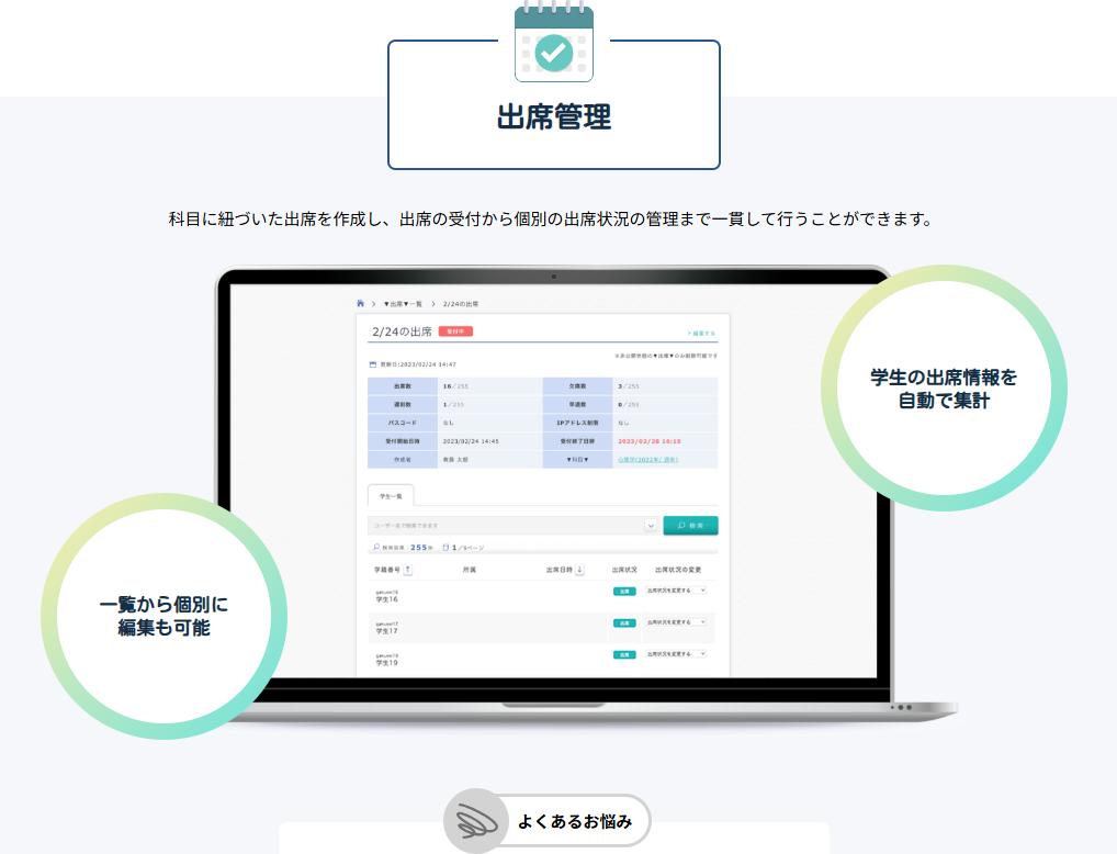 授業前の資料配布、講義動画配信、授業中の出欠確認やグループワーク、授業後のレポートやテストなど、教員と学生の間のコミュニケーションをオンラインツールで円滑にする学習支援システム